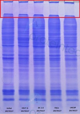 此类堵孔是由于裂解液加入量过少,导致蛋白浓度过高而聚集形成复合体,当加入变性剂和高温煮样后,此类蛋白复合物完全变性,从而堵在浓缩胶和分离胶点样孔口。