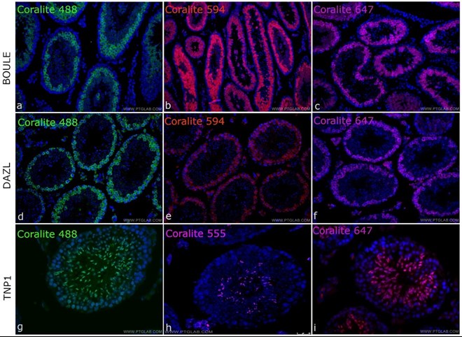 Fig 3. Same antibodies with three different Coralite conjugates. a-c) anti BOULE antibody conjugated to coralite488,594 and 647. d-f) anti DAZL antibody conjugated to coralite488,594 and 647. g-i) anti-TNP1 antibody conjugated to coralite488,555 and 647. Experiments were done on Mouse testis tissues.