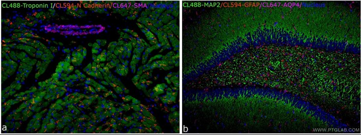 Fig 2. Multiplexed Immunofluorescence on Mouse heart and Mouse brain tissues using Coralite conjugated primary antibodies