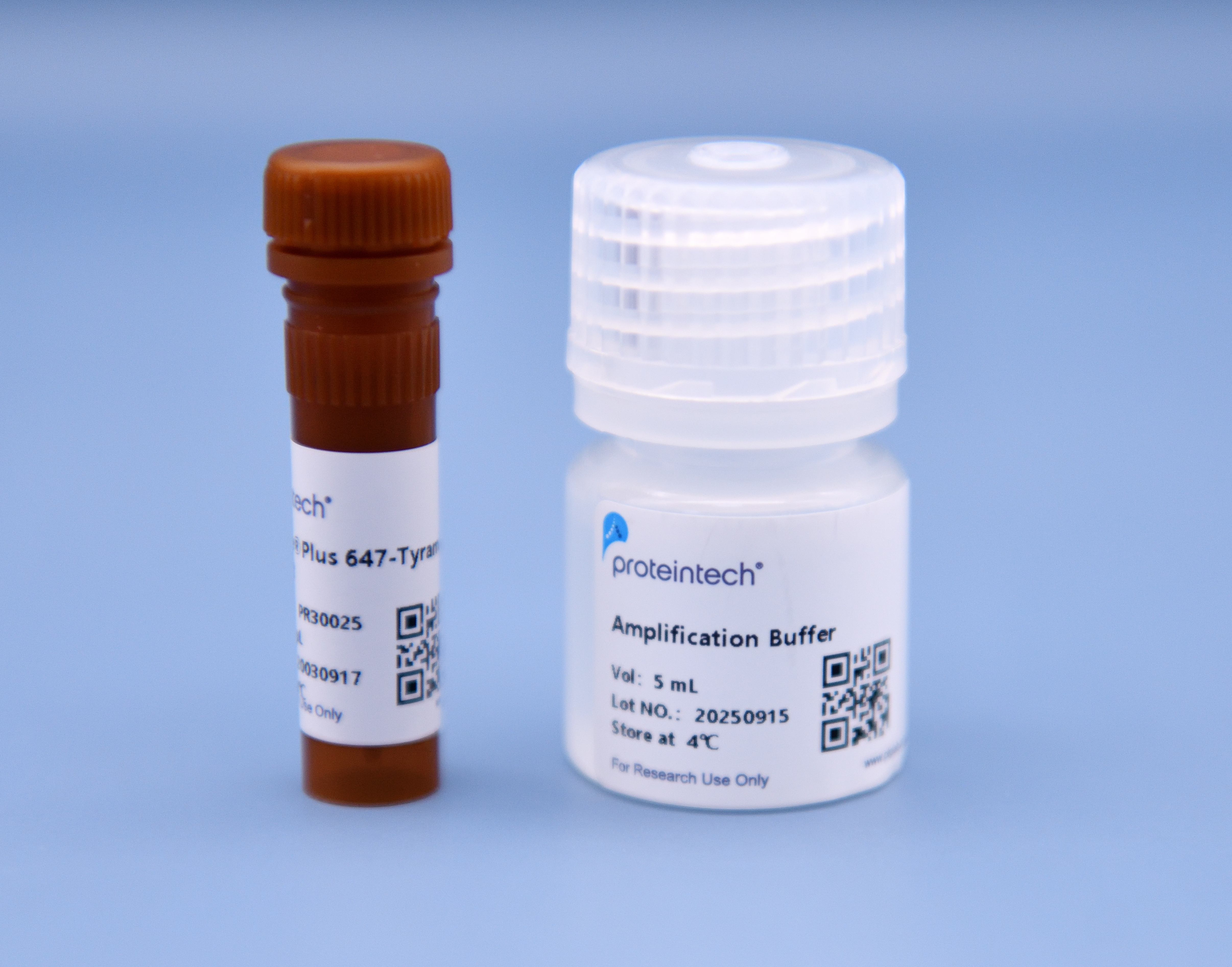 本产品为50T规格,包含100 uL CoraLite®Plus 647-TSA染料和5 mL扩增液Amplification Buffer,可以染常规组织切片或细胞爬片约50张/份,注意根据切片大小不同使用次数可能会稍有出入。实验中需要的其他试剂请自行准备或另购。